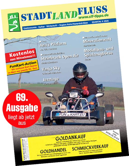 Runter vom Sofa! Seit Juli 2011 erscheint das kostenlose Veranstaltungsmagazin „StadtLandFluss“ und berichtet zu Beginn eines jeden Quartals über Konzerte, Feste, Märkte, Open Airs, Kleinkunst, Messen und Gewerbeschauen, Ausstellungen, sportliche Aktivitäten und viele weitere Events in unserer Region. In diesem Sinne: Runter vom Sofa –